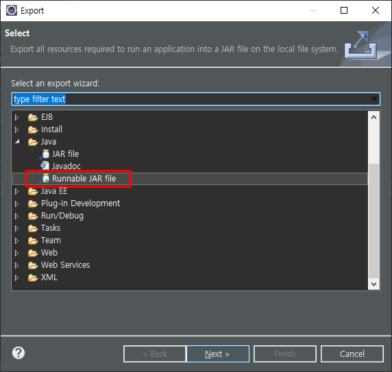 기본 단축키로는 SHIFT + ALT + X 누른다음 Q 누르면 이제 자동으로 Runable Jar 파일이 Export 가 바로 된다.