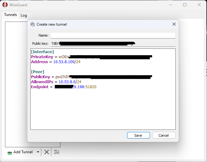 | [Client] 설정 [Interface] PrivateKey = wOEnZKxvfhf+q8ViyM/fiKtLXXdwH50CzeoRKJJkS3M= Address = 10.53.8.100/24 => /24 로 설정 [Peer] PublicKey = pwl/hIYOP8jI7H/3JfUu9DM5b76QORnK04krh5Zysyw= AllowedIPs = 10.53.8.100/24 => /24 로 설정 Endpoint = 118.000.000.000:51820 |