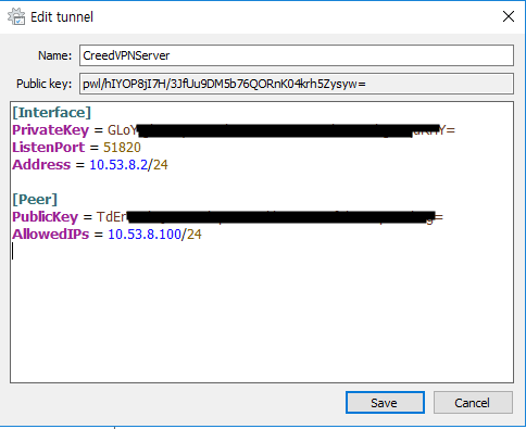 | [Interface] PrivateKey = <자동생성됨> Address = <ClientPC가 내부망 IP로 사용할 IP를 적어주면됨> -> 추후 서버에서 설정해줘야함 [Peer] PublicKey = <서버PC의 PublicKey 를 입력> AllowedIps = <사용할 내부망IP 의 마지막값을 0으로 설정> Endpoint = <서버의실제IP:서버설정포트> |